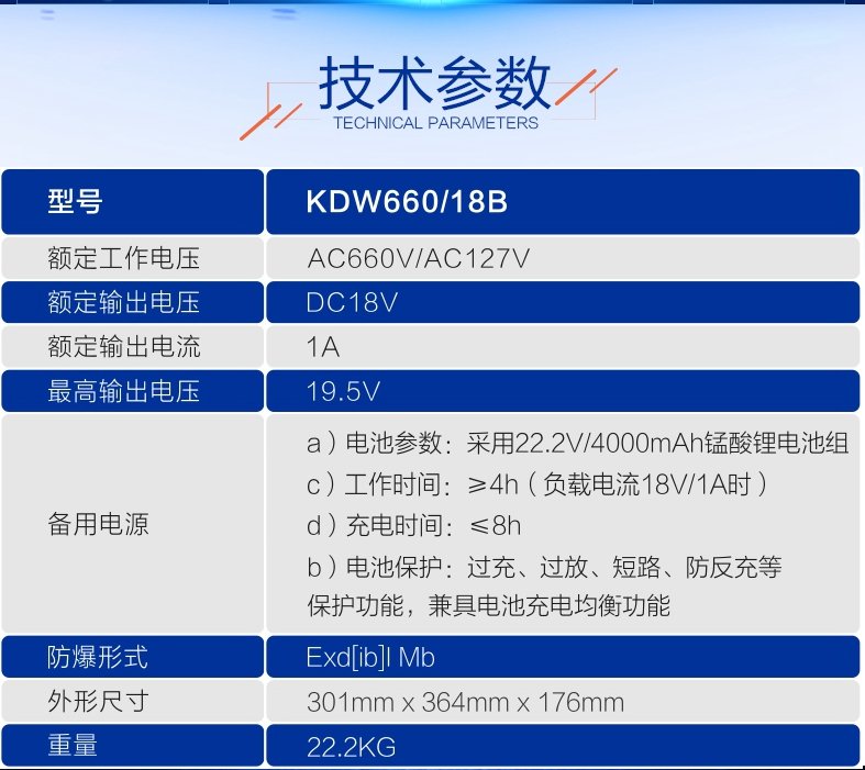 ? ? ? ?斯達防爆KDW127/18B隔爆兼本安型直流專為煤礦井下隔爆型和本安型用電設(shè)備提供DC18V電源,支持兩種電壓輸入,安裝形式多樣,方便移動,同時兼具大功率輸出、電壓穩(wěn)定、紋波小的特點。額定工作狀態(tài)內(nèi)置電池可持續(xù)供電4小時以上,滿足井下本安設(shè)備的供電要求。具備過載、過壓、過流保護功能。故障狀態(tài)恢復(fù)后,自動恢復(fù)工作。